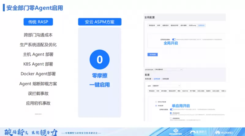 而传统方案防护存在盲点:流量层,如WAF、IDS,存在预警粒度粗,误报多、绕过率高,加密流量无法监测;应用层,传统RASP方案难以落地,部署难度大、成本高,存在兼容性适配等问题;主机层,如HIDS、XDR预警过晚,被动事后响应应用运行态入侵无法预警。