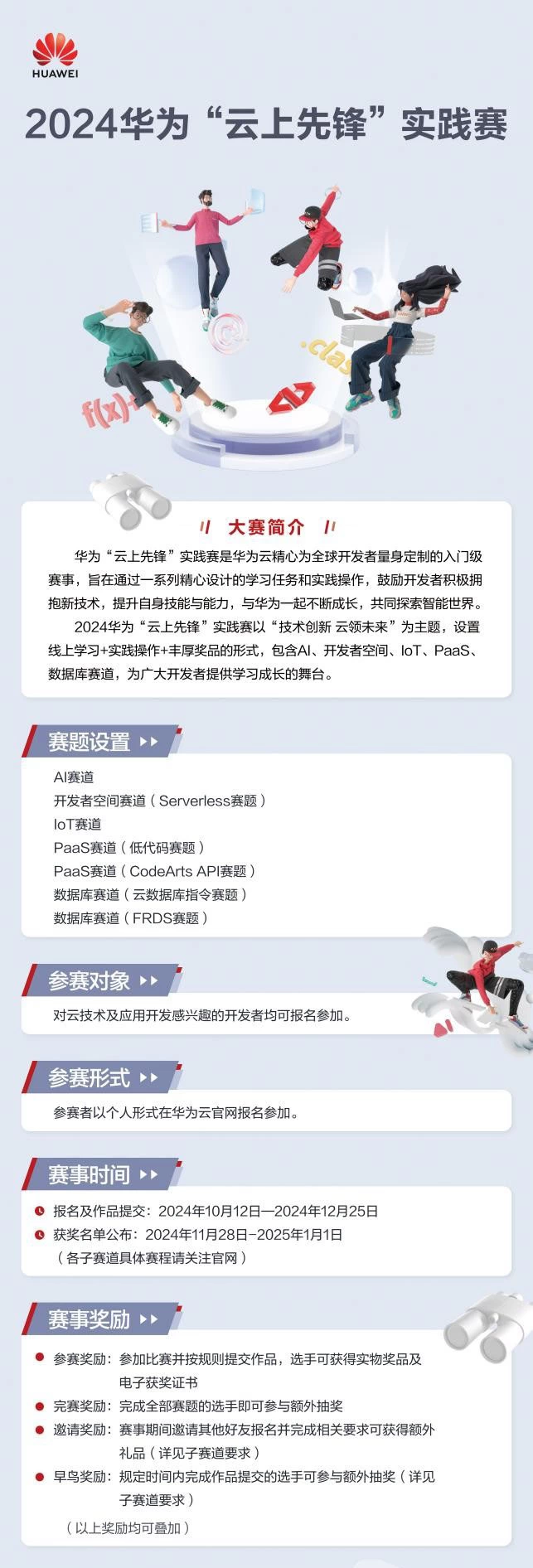 2024华为“云上先锋”实践赛以“技术创新 云领未来”为主题,聚焦开放众多华为领先的技术方案和优秀的创新成果,为广大开发者打造学习与交流的舞台。大赛亮点纷呈,设置多个平行赛题,提供众多学习资源和奖励,计划12月底结束。