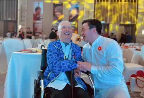 台上演讲结束,台下温馨一幕,谌鹏飞先生(右)与好人行善者梁永宁先生(左)
