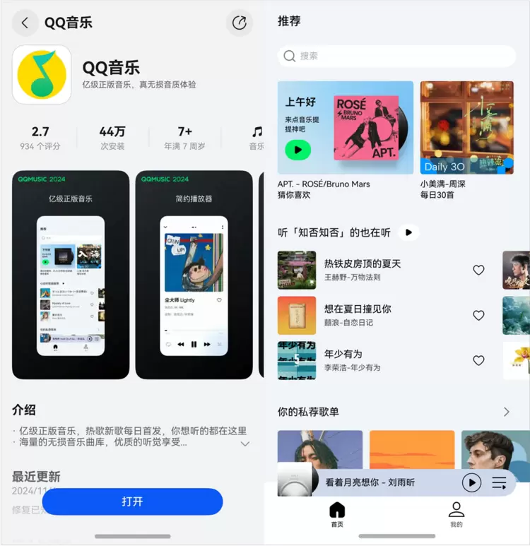 上述音乐App凭借丰富的正版曲库及高品质无损音乐,已收获了大量用户的喜爱。并且在原生鸿蒙系统上的使用体验也可圈可点。打开鸿蒙原生版QQ音乐,可以看到底部导航栏「首页」、「我的」两个核心模块已上线,界面简洁干净、操作流畅。各类音乐榜单和歌单、新歌等高频功能都可支持,个性化推荐功能可为你量身推荐喜欢的音乐,此外用户还可以自建和收藏歌单。