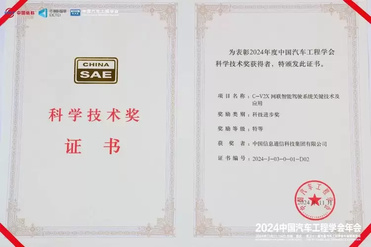 2024年11月12日,中国汽车工程学会于重庆科学会堂召开首届科学技术奖励大会暨高等级奖项技术分享会,以及特等奖获奖项目和创新团队奖(零部件)获奖团队的技术分享。会上,“C-V2X网联智能驾驶系统关键技术及应用”荣获2024年度中国汽车工程学会科学技术奖特等奖。作为第一完成人,中国信科集团副总经理、总工程师陈山枝博士代表项目团队,出席奖励大会,并进行技术分享。