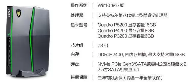 微星科技一直将台式机工作站看做重中之重,这次历时多年所推出的第一台W25台式机工作站,简单洗炼的外型,将NVIDIA Quadro P5200专业显卡的强大效能凝聚在2.5公升的微型机身,不仅解决过往台式机佔据庞大工作空间的痛点,性能更大幅提升40%,同时配备的最新英特尔第八代六核处理器,也较前一代提升30%的性能,让W25成为处理高端三维和虚拟现实任务的最佳选择。