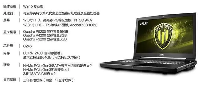 生活中我们总被性能和移动性所限制,不知如何对台式机和移动机做出选择,现在好了,MSI要给你一个移动的台式机——WT75工作站,它拥有出色的运算效能和长时稳定运行的能力,同时以移动工作站的机身融合前所未见的台式机等级P5200显卡和具备台式级同等的长时稳定运行能力,是个实力雄厚的大咖。此外, WT75搭配的英特尔第八代至强处理器更可将性能大幅提升50%,除了性能提升,微星也将微软Hello指纹辨识,智能读卡机英特尔®身份验证解决方案等安全功能导入WT75,实现更强悍的个人身份保护。
