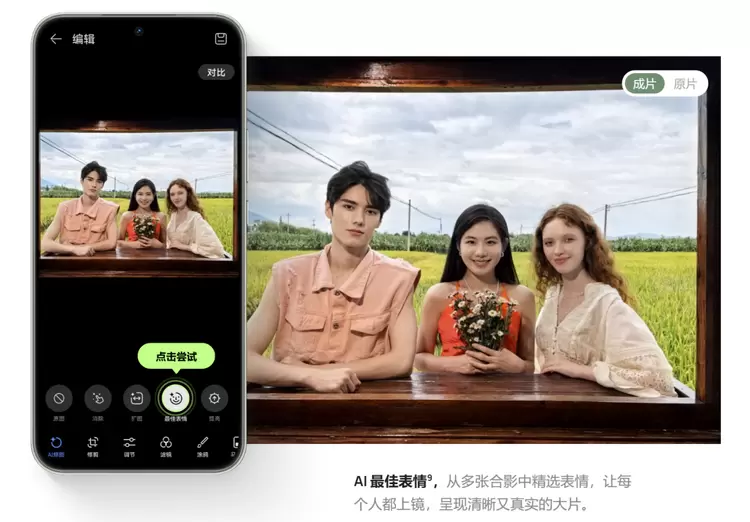 不仅如此,华为nova 13系列还带来了业界首发的AI最佳表情功能,它可以自动从连拍照片中挑选出每个人的最佳表情,智能合成一张所有人状态都在线的完美合照,在生日派对、公司团建等需要多人合影的场合中尤为适用(可以有效避免有人表情管理失败重新拍照的麻烦)。