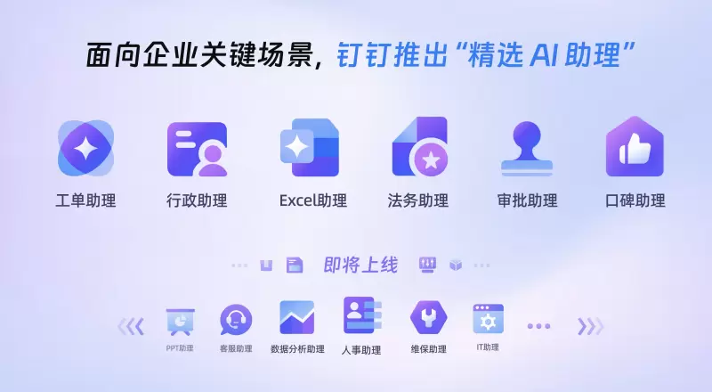 钉钉认为,AI 需要提供场景化的智能服务,真正走入到应用、协作、经营等场景中。接下来,PPT 助理、客服助理、数据分析助理、人事助理、维保助理、IT 助理等一系列 AI 助理也将陆续上线。