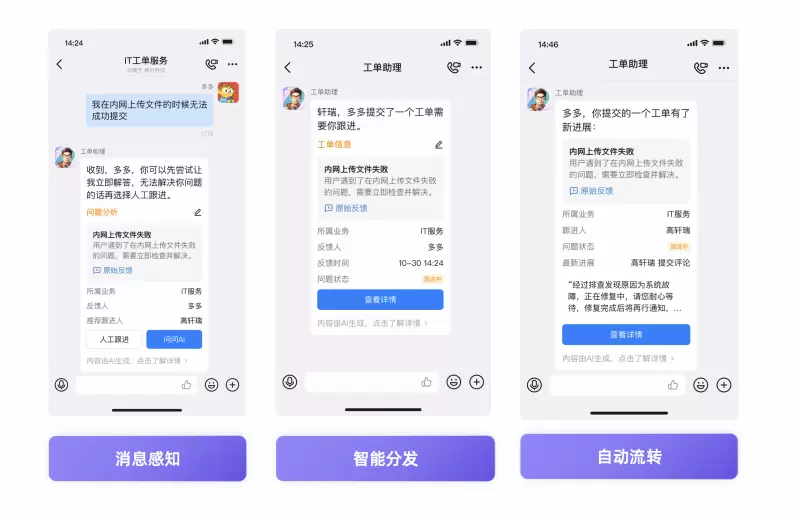 ● 工单助理:专注于解决工单流转效率低、信息更新不及时的问题,可以根据消息上下文,主动识别问题、生成工单并完成派单;它还支持自动跟进处理进度,做到实时同步。