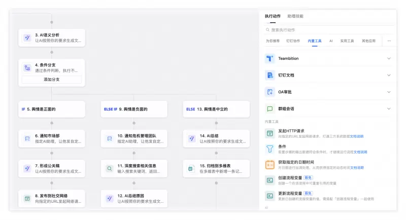 在钉钉 AI 的底层能力方面,可视化编排等功能已上线,供企业和开发者创建 AI 助理使用,提升了可用性和产品体验。