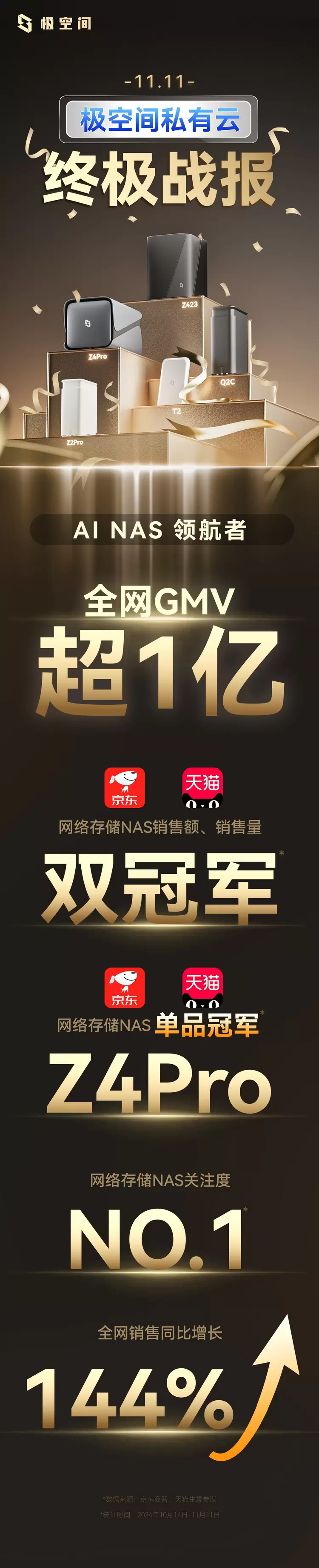 近日,史上最长双十一电商盛宴正式落下帷幕,各大品牌也在这场大考中纷纷呈上自己的成绩单。在网络存储行业,极空间私有云凭借其卓越的产品力和优秀的用户口碑,不负众望地取得耀眼成绩。数据显示,极空间私有云在本次11.11大促中斩获多项殊荣:极空间成为京东&天猫网络存储NAS销售额、销售量双冠军;明星机型Z4Pro勇夺京东&天猫网络存储NAS热销单品冠军,全网GMV超1亿,全网销售同比增长144%。网络存储NAS关注度第一也让极空间私有云当之无愧成为NAS行业最耀眼的那颗星。