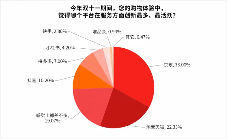 在消费者眼中,京东的创新服务无疑是最具吸引力和竞争力的。超33%的受访者表示,京东是他们认为今年双十一期间服务创新最多、最活跃的平台。这一结果不仅反映了京东在创新服务方面的领先地位,也体现了消费者对京东创新能力的认可和期待。