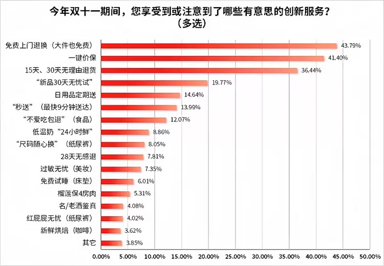 调查数据显示,在双十一期间,受访者享受到了或注意到了多种创新服务,这些创新服务在很大程度上提升了消费者的购物满意度。其中,免费上门退换、价保、15天/30天无理由退货等已成为各大电商平台的标配服务。然而,京东在此基础上进一步推陈出新,推出了如不爱吃包退、名酒鉴真、24小时鲜、28天无感退等一系列独具特色的创新服务,这些服务不仅满足了消费者的多样化需求,更提升了消费者的购物体验。