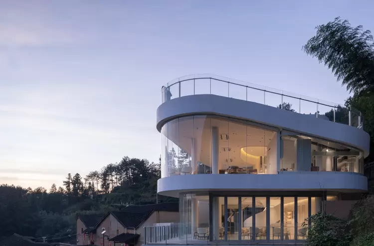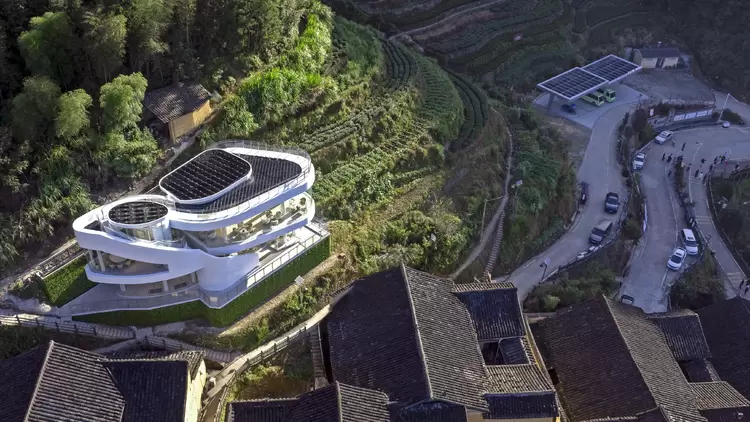 下党零碳示范的主体建筑“宁的茶”零碳茶馆是一座上下两层的纯白建筑,整体面积约300平米。屋顶以莫比乌斯环为设计灵感,将可持续理念贯穿在每一处细节。整个建筑采用BIPV(光伏建筑一体化)技术,目前已实现全周期绿电直供。同时在建筑外观上应用大面积超白玻璃和UHPC超高性能混凝土,满足通透的视野、充足的采光的同时,有效降低能源消耗。