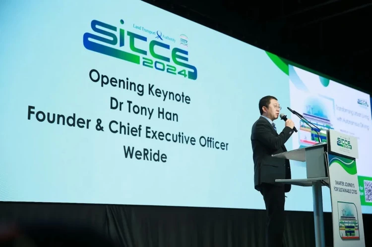 (文远知行创始人兼CEO韩旭在新加坡国际交通大会开幕式发表主题演讲。图源:SITCE 2024)