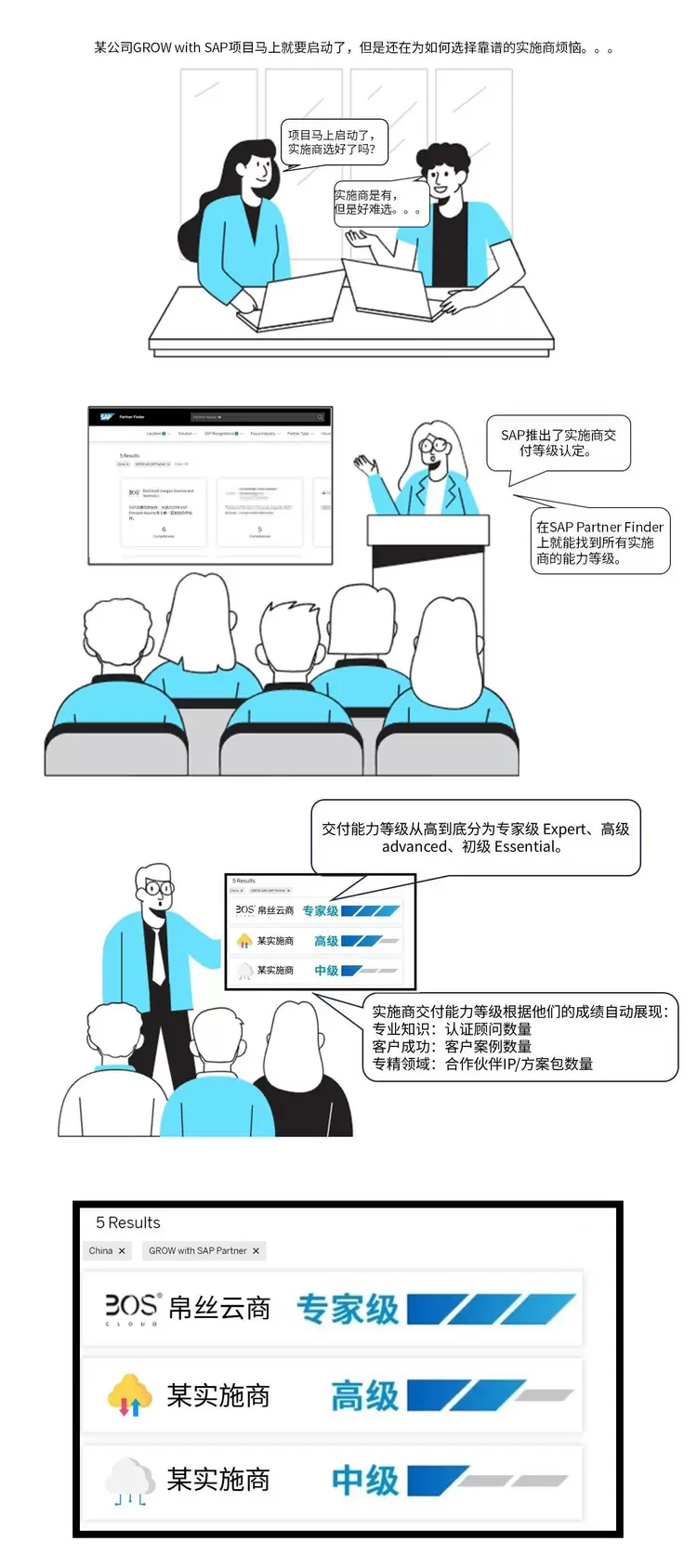 帛丝云商BOS Cloud是SAP中国区合作伙伴中为数不多同时具备GROWwithSAP与RISEwithSAP专家级资质的合作伙伴,而这一等级的评选,是根据合作伙伴的客户案例数量、认证顾问数量、合作伙伴IP/方案包能力来综合认定的。BOS Cloud帛丝云商是SAP中国区拥有最多GROW with SAP(SAP ERP 公有云)成功客户案例的合作伙伴,同时具备超过30名SAP ERP云认证SAP顾问,选择BOS Cloud帛丝云商,就是选择与值得信赖的SAP伙伴合作。