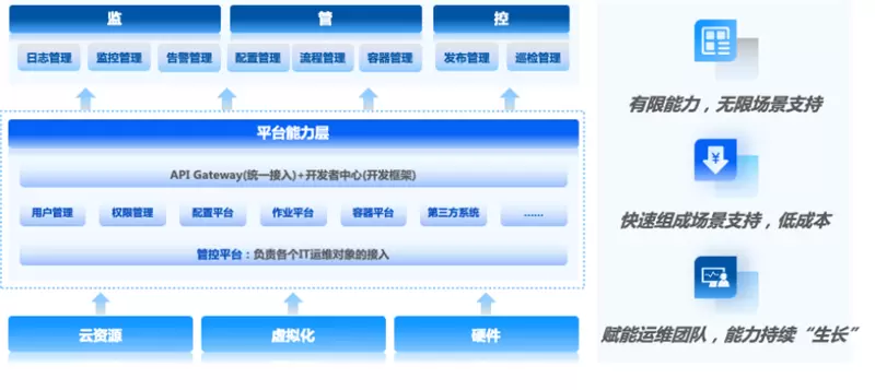 构建具备一体化能力的PaaS平台,实现对运维对象的集中纳管;高效管理各类运维资源,确保运维权限的统一分配与管理;支持运维数据的联动共享,提升运维团队的工作效率和响应速度。