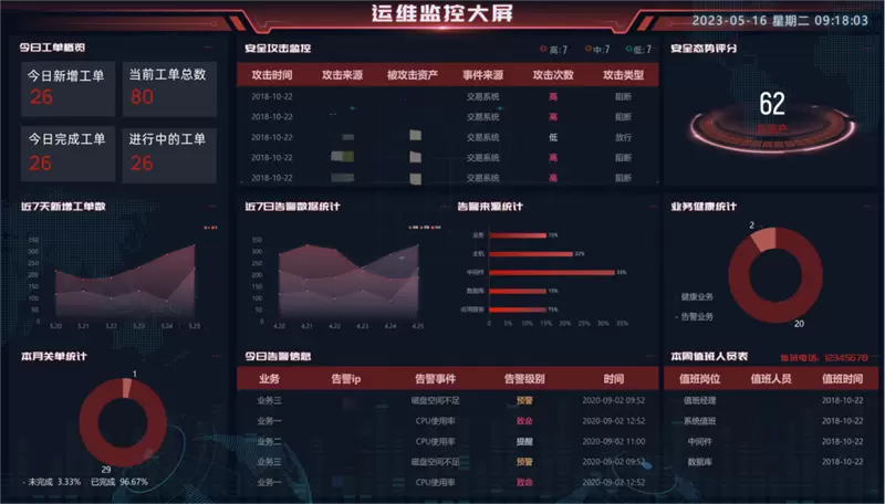 场景价值:打造统一运维监控大屏,实现对工单、安全攻击、安全告警等相关信息的监控,提升了运维管理的效率与安全性,确保业务运行的平稳与连续。