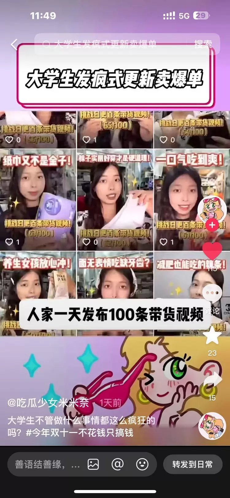 最终,小然成功在双十一期间完成日更百条带货视频,并成功成交上千单。小然双十一短视频带货的成功,成为了数字时代下大学生创业尝试的案例。