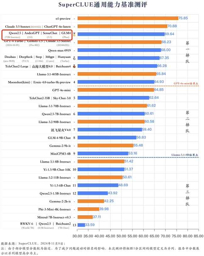 11月8日,中文大模型测评基准SuperCLUE发布《中文大模型基准测评2024年10月报告》,智谱GLM-4-Plus凭借出色的能力表现,在43个国内外大模型中位居第一梯队,总得分位列国内大模型首位。
