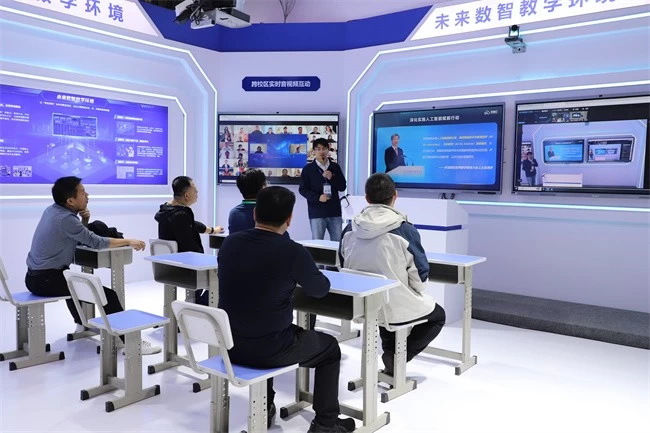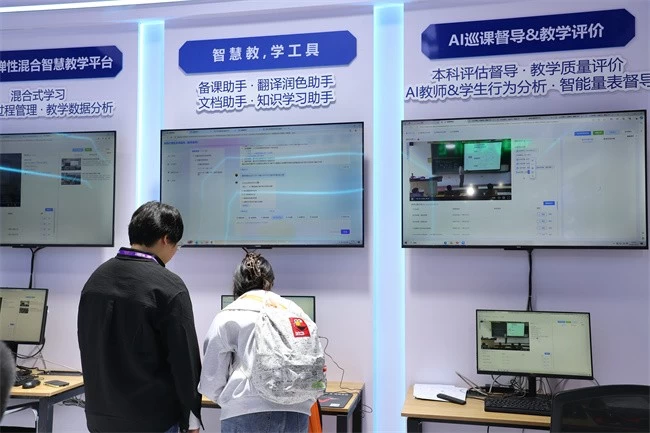 展位现场,华栖云模拟了真实的教室环境,展示了利用RTC实时流技术与专业超高清流矩阵能力打造的沉浸式教学场景,以及跨校区实时音视频互动。同时,融入了智慧教、学、评工具,让观众置身模拟的教室空间中,切身感受数智教育技术与教育教学的深度融合。