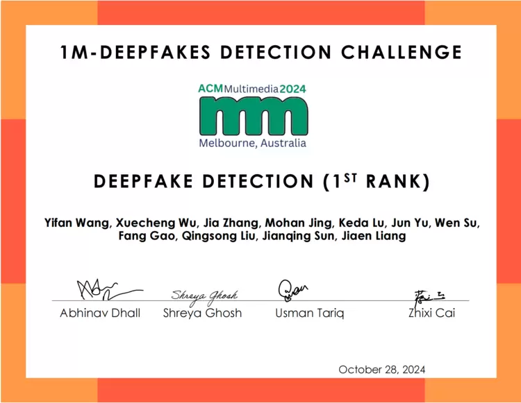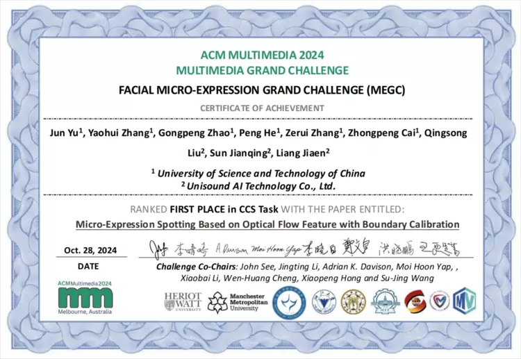 在这场全球顶尖智慧团队间的激烈角逐中,联合团队表现出色,在多个挑战赛道上夺得5项冠军、2项亚军,其研究成果广泛涉及微动作分析、微表情检测与分析、人机交互与对话、多模态群体行为分析以及视觉空间关系描述和深度伪造检测等前沿领域。具体获奖情况如下: