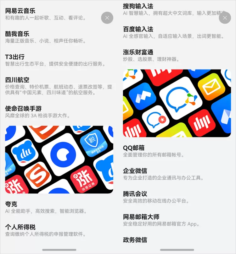 在音乐领域,网友期待的网易云音乐和酷我音乐即将与大家见面,与已经上架的QQ音乐、酷狗音乐、汽水音乐等一起,为音乐爱好者们打造一个全面完整的音乐生态。对于职场人士而言,企业微信、腾讯会议等办公利器的加入,将使得工作效率更上一层楼。同时,个人所得税、QQ邮箱、网易邮箱、政务微信、夸克浏览器等实用工具也将为用户的日常生活和工作带来极大的便利。出行领域,有T3出行和四川航空;游戏方面,风靡全球的枪战类手游使命召唤终于要来了;输入法方面,搜狗输入法、百度输入法两款主流输入法即将上架,让用户多一种选择。