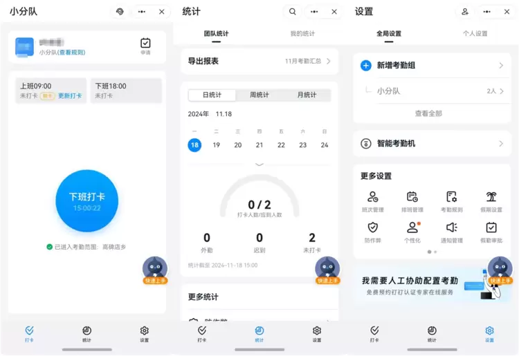 我第一时间更新了鸿蒙版钉钉,体验后发现,点击主页面下方的「更多」选项,就能进入“考勤”功能,包括打卡、假期申请、统计、设置等模块在内的考勤功能都已上线,不仅可以完成日常打卡,还能够自动统计打卡明细、团队及个人周/月考勤数据,比之前更全面、智能了。我还发现,在设置选项中,大家可以灵活配置考勤规则、个人偏好、考勤机设置,进行排班管理、班次安排、假勤审批等高频考勤管理工作。