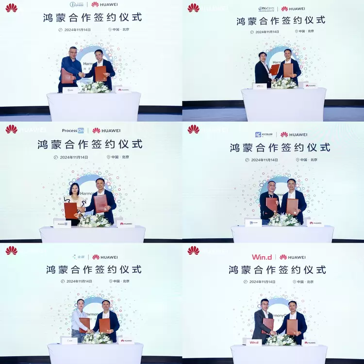 为持续促进面向企业工作应用领域的鸿蒙生态规模发展,现场,华为还与12家企业举行了鸿蒙原生应用合作签约仪式,包括信安世纪、同方知网、北京大麦地、北京合创芯彩、金蝶软件(中国)、万得、彩讯股份、大智慧申久、天融信、格尔软件、用友、中孚安全等公司将启动鸿蒙原生应用开发。本次签约伙伴覆盖了信息安全、生产力工具、金融投资、企业管理等企业办公的各个领域,进一步加速了原生鸿蒙在多场景的落地应用,为更多企业提供多样化和专业化的服务。
