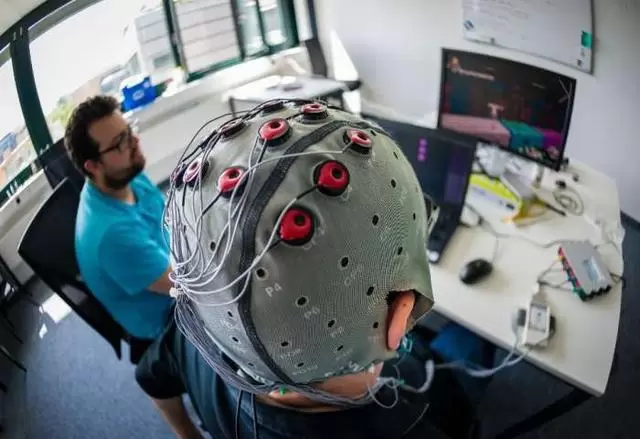 洛桑,瑞士 - 2016年5月27日:瑞士洛桑(EPFL)瑞士联邦理工学院神经科学实验室的测试人员戴着脑机接口(BCI)罩,将大脑活动转化为信号控制一台电脑。BCI技术旨在让行动不便的人增加其独立性或使完全瘫痪的患者能够与他们的环境进行交流。在这个特定的实验室会议中,那个截瘫并坐在轮椅上的测试人员正在训练通过电脑游戏驾驶他的想法。该游戏是“Cybathlon”的学科之一,这是一项残疾赛车飞行员锦标赛,将于2016年10月在瑞士克洛滕举行。EPFL神经科学家团队对获胜感到乐观!