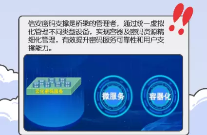 信安密码支撑则是桥梁的“管理者”,通过统一虚拟化管理不同类型设备,实现容器及密码资源精细化管理,有效提升密码服务可靠性和用户支撑能力。