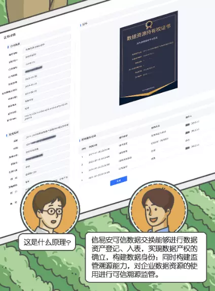 信易安可信数据交换能够进行数据资产登记、入表,实现数据产权的确立,构建数据身份,同时构建监管溯源能力,对企业数据资源的使用进行可信溯源监管。
