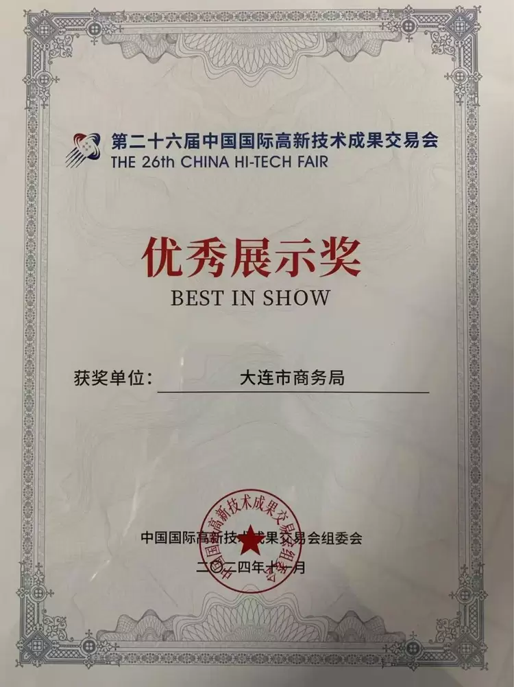 高交会已成为我市企业展示实力、拓展市场、寻求合作的重要舞台。本届高交会,大连展团共获得11个奖项。大连市商务局荣获优秀展示奖和最佳组织奖。大连华科电子科技有限公司、大连语智星科技有限公司、亿达信息技术有限公司、大连海事大学、大连蓝雪智能科技有限公司、大连理工大学人工智能大连研究院以及大连东锐软件有限公司等7家单位凭借出色的科研成果和创新实力,荣获了优秀科研成果创新奖。华录集团凭借其卓越的展示效果荣获了优秀展示奖,易华录因其突出的科技创新表现荣获了优秀科技创新企业奖,华录视听再次以其实力雄厚的科研成果荣获了优秀科研成果创新奖。