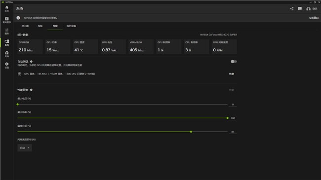 NVIDIA app系统页面精心划分为“显示器”,“视频”,“性能”和“我的装备”四大模块,以满足用户多样化的需求。其中显示器模块为用户提供详尽的显示设置选项,包含分辨率、刷新率灯,确保用户能够享受到最佳视觉体验。而性能模块包括了显卡状态监控及GPU优化功能,玩家可通过“自动调优”一键优化,也可以手动在“性能限制”模块中调节。