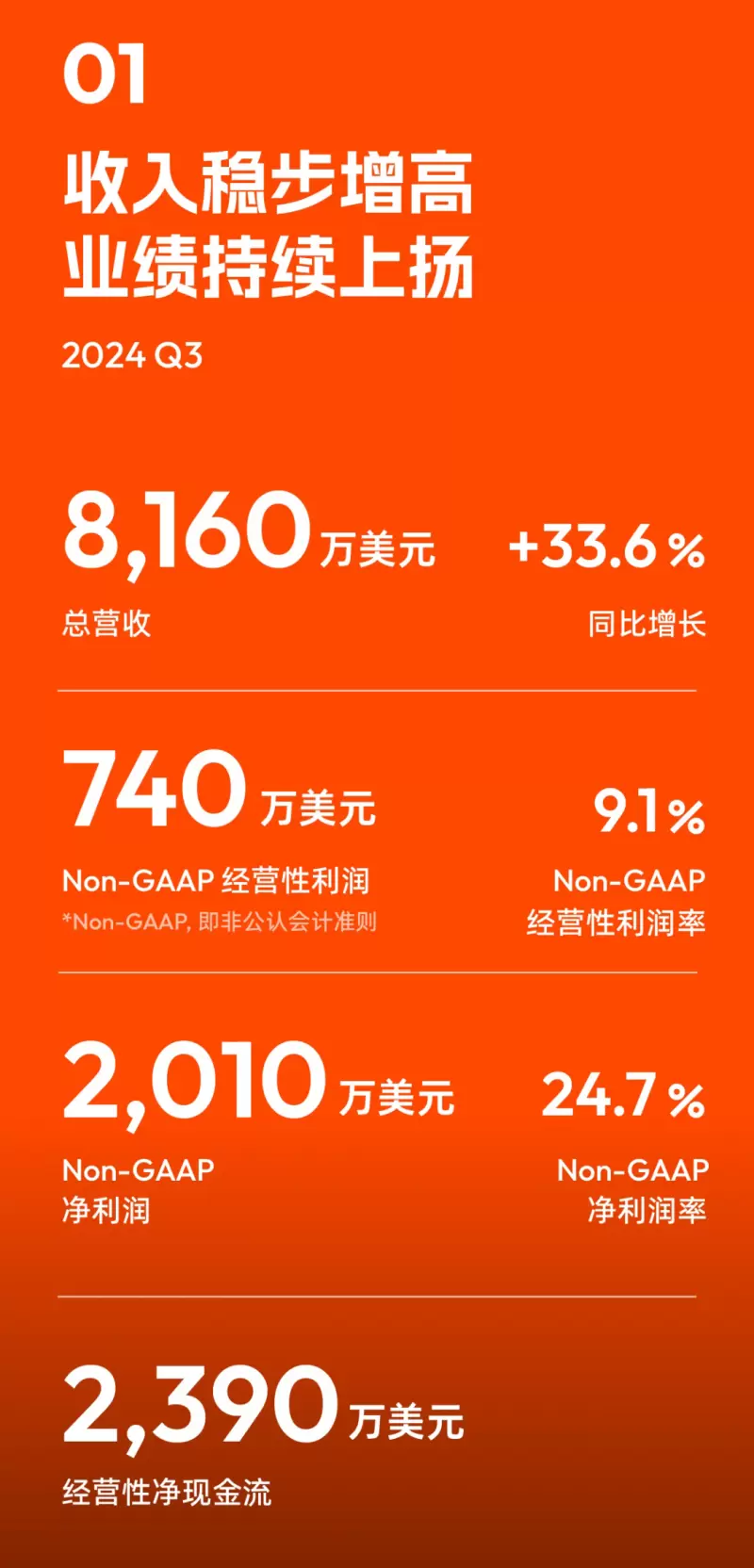 财报显示,2024年第三季度总营收为8,160万美元,同比增长约34%。非公认会计准则(non-GAAP)净利润为2,010万美元,净利润率同比提高了8.2个百分点至24.7%,经营活动产生的净现金流入为2,390万美元,同比稳步增长。