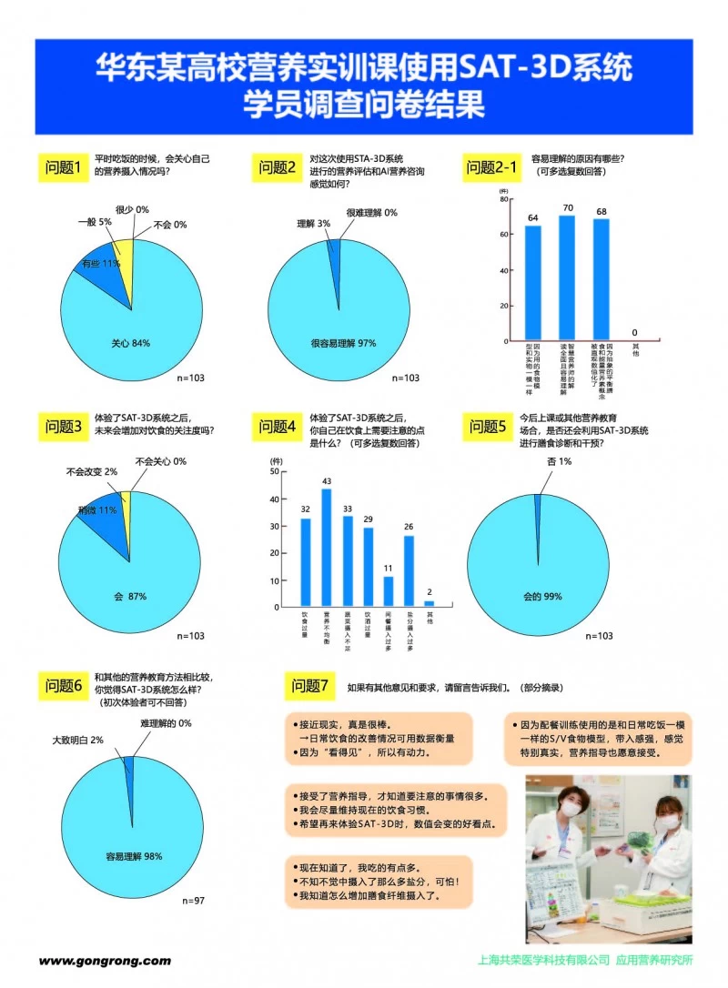 为了进一步验证SAT-3D系统的实际效果,上海共荣在沪上高校内进行了问卷调查。调查结果显示,SAT-3D系统无论是在营养科研还是实训教学领域,都发挥了重要作用。这一工具的诞生,不仅促进了中国营养教育事业整体水平的进步和提高,更是中国营养学人科技创新的典范。