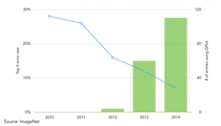 在研究员 Alex Krizhevsky 和他的同事们赢得 2012 年 Imagenet 竞赛后,深度神经网络与 GPU 配对的优势变得显而易见。其余都是近期的历史。