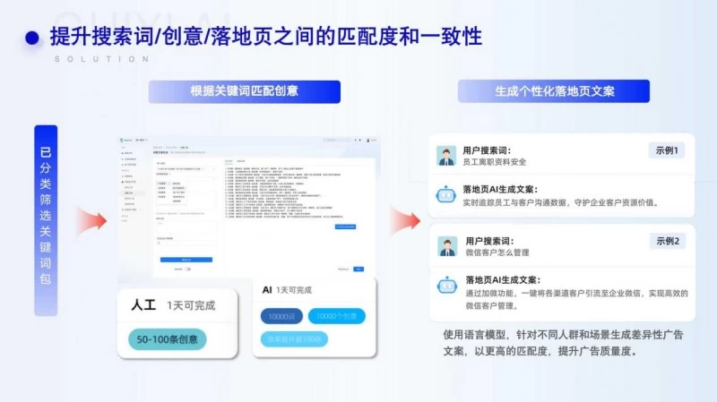 现针对该客户已归类的超1150万关键词,再次借助AI搜索投手的强大功能,「利欧归一」具备全面的营销领域知识,可根据用户需求和对应的页面作为上下文撰写广告创意,能极大的提升搜索需求、广告创意与落地页3者之间的匹配度,真正实现了让广告与用户需求精准对接,确保所搜即所得,从而显著提高广告的展现机会,吸引更多潜在客户点击浏览,有效促成付费行为。