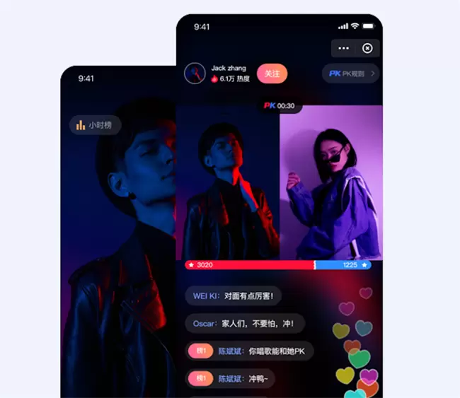 借助实时内容互动引擎创新直播互动,App 内直播间可以与观众进行PK、狼人杀等互动小游戏,提升用户的参与度与粘性,变现更高一筹。