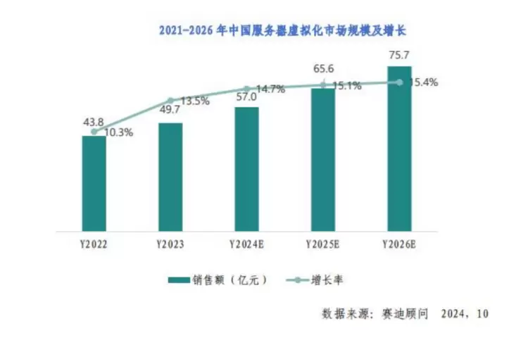 《报告》指出,虚拟化作为数字化基础设施的重要软件,在金融、政府等众多行业拥有广泛的用户基础。随着各行业基础架构安全升级需求的增加以及VMware服务模式的调整,虚拟化存量替换需求持续增长,预计未来三年市场规模将持续扩大。到2026年,中国服务器虚拟化市场规模有望达到75.7亿元,同比增长15.4%。