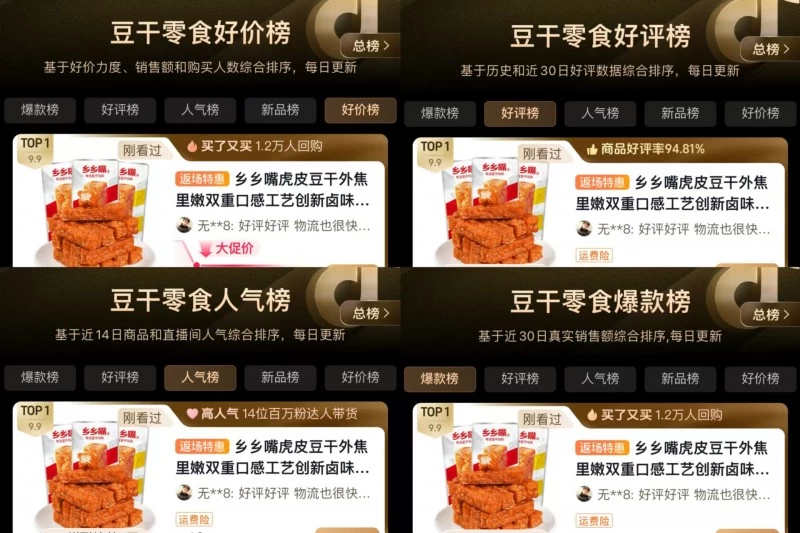 面对休闲豆干行业当下的种种现状,乡乡嘴从 “推出一款更好吃的豆干” 这一质朴却又意义非凡的简单想法出发,历经了长达两年的精心研发与反复打磨。凭借着乡乡嘴16年沉淀积累的实力与底蕴,虎皮豆干一经上市便成为爆款,蝉联多个豆干零食榜单冠军。