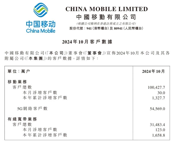 数据显示,2024年10月份,中国移动用户总数达到10.04277亿户,当月净增客户数30万户。有线宽带方面,中国移动有线宽带客户总数达到3.14834亿户,当月净增客户数123万户。