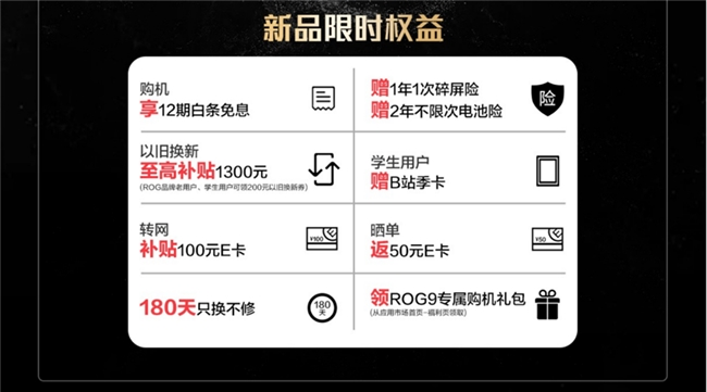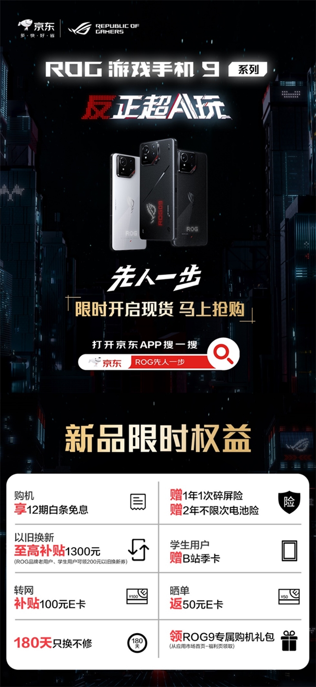 独特且硬核的个性化体验,让全新登场的ROG 9系列再次成为玩家们的首选。即日起,逛京东搜ROG 9,全款预售期间购机享12期白条免息,赠1年1次碎屏险、2年不限次电池险,学生用户可额外领B站季卡,以旧换新至高补贴1300元!