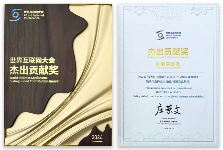 开幕式上,大会首次颁发了“世界互联网大会杰出贡献奖”,以表彰在全球互联网相关领域做出杰出贡献的个人和企业。科大讯飞获得“杰出贡献奖-创新突破类”奖项,获颁理由为“专注大模型迭代升级,持续拓展人工智能技术应用外延,以系统性技术创新赋能千行百业”。