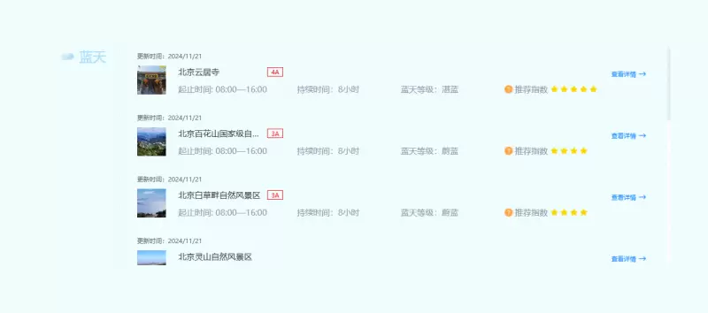 “气象景观数字化服务平台“和“漫步北京“小程序,利用先进的气象预报技术和多源观测数据,为游客提供精准的气象景观预报服务。通过小程序游客可以提前了解北京地区的蓝天、白云、朝霞、晚霞、云海、星空等气象景观的分布情况和出现时间,从而提前规划行程,确保在最佳时间欣赏到最美的气象景观。这种精准预报和提前规划的方式,不仅提高了游客的出行效率,还增强了游客的旅游体验。