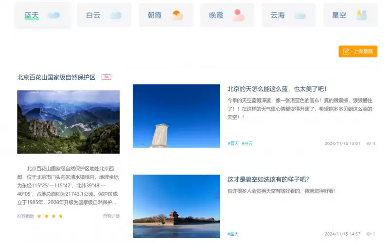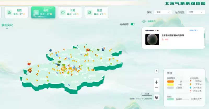 通过“漫步北京”小程序,游客可以轻松获取北京未来3天的蓝天、白云、朝霞、晚霞、云海、星空等特色气象景观的预报。与此同时,“气象景观数字化服务平台”则为用户提供了更为丰富、深入的气象景观资源。该平台整合了北京地区的气象数据与旅游资源,通过高精度的气象模型与数据分析,为用户呈现出更为精准、全面的气象景观预报。无论是想要了解某个景点的景区介绍,还是想要规划一次特定的气象景观之旅,气象景观数字化服务平台都能满足您的需求。