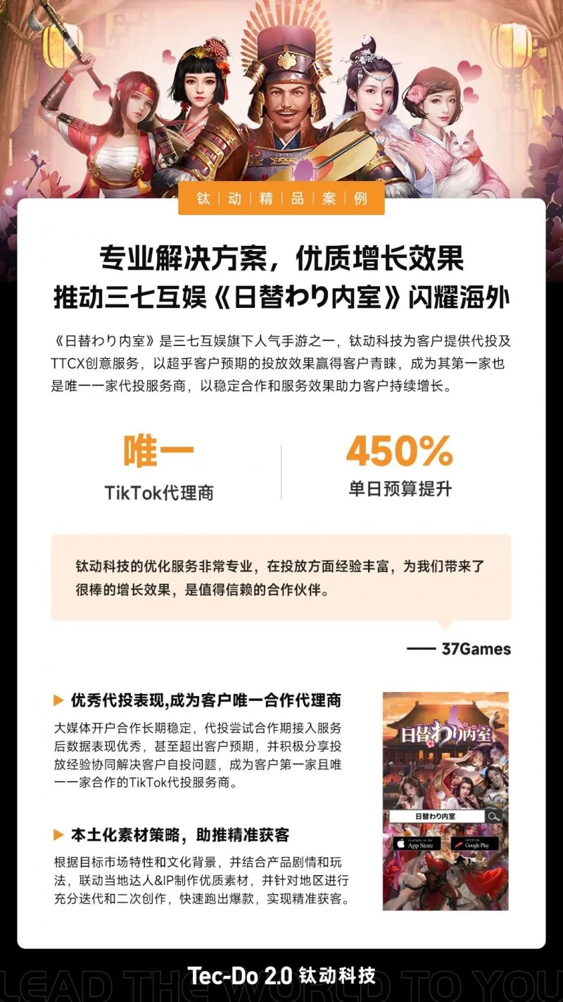 凭借优质增长效果表现,钛动科技成为三七互娱《日替わり内室》唯一合作代理商。