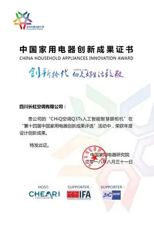 众所周知,IFA 展每年都吸引了全世界众多知名品牌和最创新的科技产品参与,它所带来的不但是各行各业最新、最潮、最具吸引力的产品,还是各大行业的潮流风向。由中国家用电器研究院主办、柏林国际电子消费品及家电展览会德国工商会支持的享誉全球的“第十四届中国家用电器创新成果推介”活动于IFA展会开幕当天同期举行。从2005年至今,“中国家用电器创新成果推介”活动已经成功举办十四届,致力于将中国家电最具影响力、最具竞争力的创新成果带上国际舞台,让全世界近距离了解并认可中国家电企业的创新实力。长虹CHiQ 空调Q3Ts人工智能智慧眼柜机在本次“中国家用电器创新成果推介”活动上大秀技术与功能创新设计实力,得到专家评委的一致认可,荣获“年度设计创新成果”奖,通过IFA这个世界级大舞台,为中国“智”造续写荣誉,向世界传递出长虹空调品牌卓越的设计创新能力。