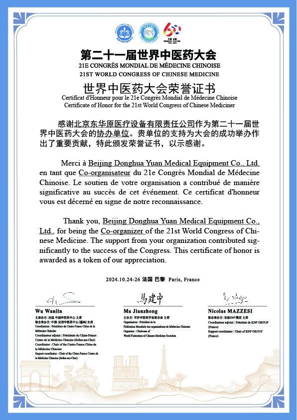 近日,第二十一届世界中医药大会组委会向北京东华原医疗设备有限责任公司(以下简称“东华原”)发来荣誉证书,以感谢其在大会筹备中做出的重要贡献。大会筹备期间,东华原积极响应组委会工作安排,全力投入到大会的会务筹备工作中,赢得了各方的高度评价。