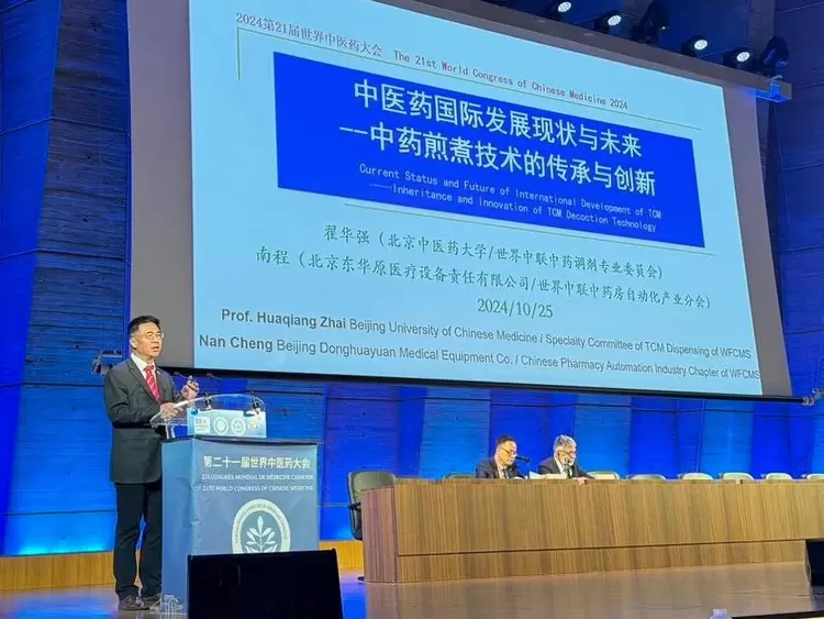 在大会主会场,北京中医药大学翟华强教授与南程联名作了题为“中药煎煮技术的传承与创新”的主题报告。翟教授在报告中详细说明了中药煎煮的历史源流和现代中药煎药的产业创新、国内外现状,并结合实际应用案例,展示了东华原最新的代煎调剂系统、代配调剂系统、协定方调剂系统和配方颗粒调剂系统在推动现代中医药调剂产业化发展中承担的重要角色。