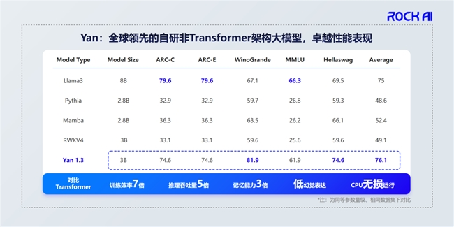 RockAI的Yan1.3是3B的模型,已经达到Llama3 8B的水平。大家可能会好奇,为什么我们会选择Llama3的8B?因为国内部分模型厂商是用Llama3的8B来套壳,以3B达到8B的效果,意味着我们的信息密度远远高于Llama。在这样的情况下我们套不了壳,因为没法用他们的东西。