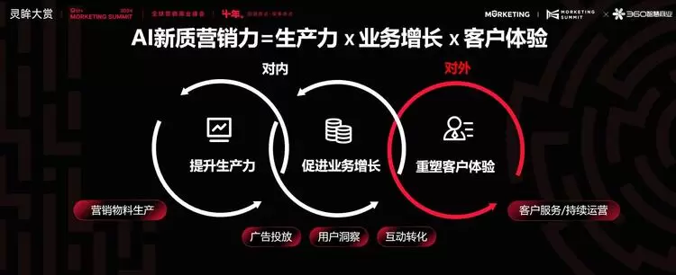 “我们认为,企业新质营销力的打造是由内而外的。对内,一方面它通过提升营销物料的生产制作效率与质量,提升了营销生产力;另一方面,AI辅助人工进行广告投放、用户洞察、互动转化,实实在在促进了业务增长。对外,它通过个性化的客户服务和用户运营,重塑了客户体验,也深度挖掘了用户价值,从而提升了用户体验和品牌影响力。”