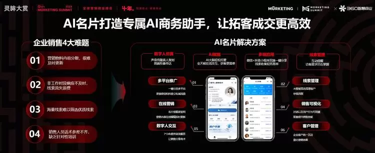 360AI名片有效解决了企业销售中营销物料分散、难以及时响应、线索筛选困难、话术不统一等痛点。它支持营销内容在线编辑实时更新,多平台推广,承接微信和抖音公私域流量。而且销售的数字人分身可7*24小时提供咨询服务,智能筛选高潜客户,秒级回复,显著提升企业拓客成交效率。